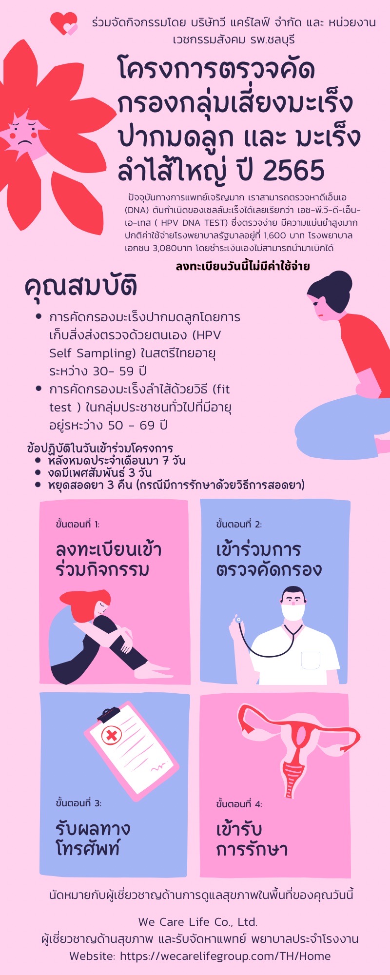 กิจกรรม การตรวจคัดกรองมะเร็งปากมดลูก และมะเร็งลำไส้ใหญ่ ร่วมจัดกิจกรรมโดย บริษัทวีแคร์ไลฟ์จำกัด และ หน่วยงานเวชกรรมสังคม รพ.ชลบุรี 1 ตุลาคม – 31 ธันวาคม 2565